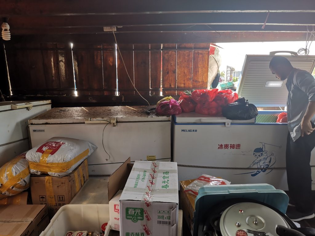 除了淡水,还有食物也是必不可少的。我们的谢大厨准备了满满三大冰箱的食物,保障船员每日三餐无忧。(还有各种小零食哦)