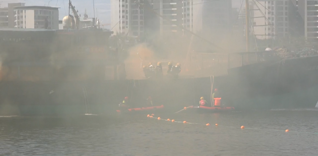 本次演练分为初期处置、应急响应、联合处置、灾后处置、总结讲评5个阶段进行,主要通过遇难渔船发出警报、灾情侦查确认、组织指挥、增援到场、人员搜救、紧急救护、渔船灭火、清理现场等科目展开,在历时一小时三十分后,应急救援演练取得了圆满成功。